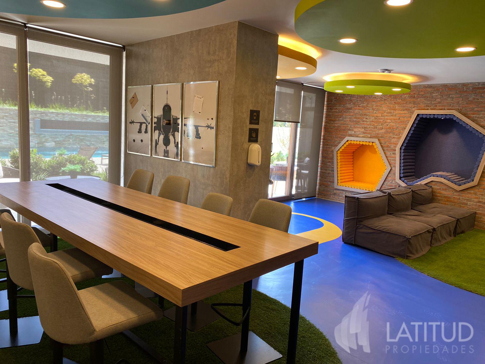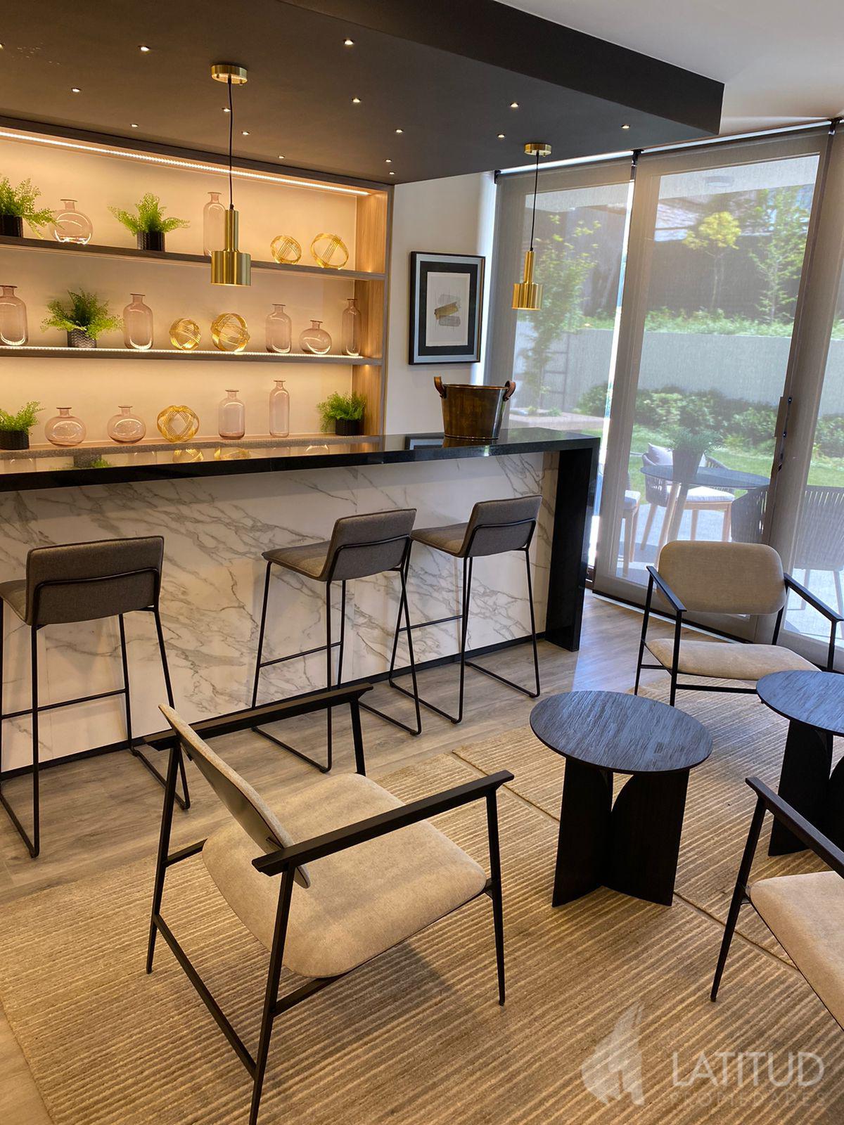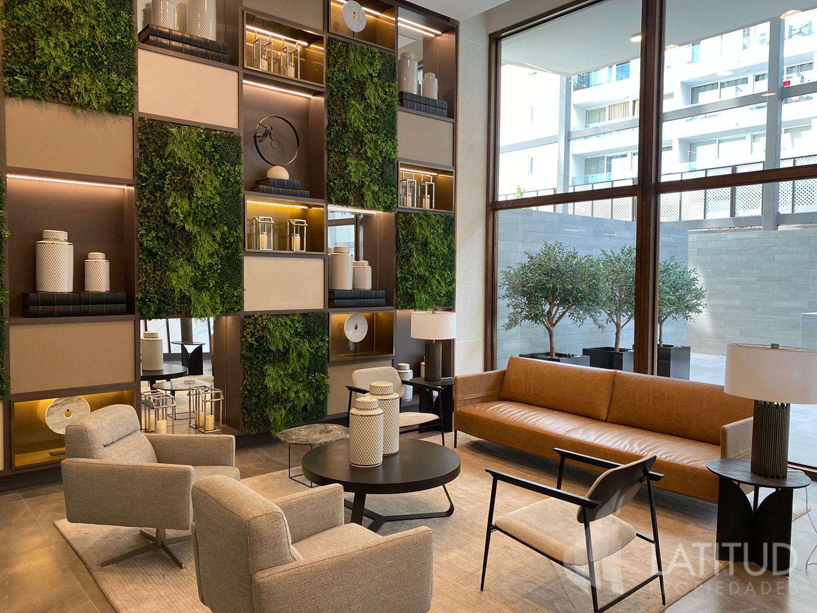 Living, cocina integrada, amoblada y equipada con horno, encimera vitrocerámica y campana.